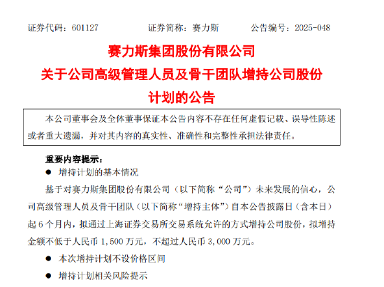赛力斯4月8日公告,基于对公司未来发展的信心,公司高级管理人员及骨干团队拟自公告披露日起6个月内,通过上海证券交易所交易系统增持公司股份,拟增持金额不低于1500万元,不超过3000万元。本次增持不设价格区间,增持主体将通过集中竞价或相关法律法规允许的其他方式实施。增持资金来源为自有资金及自筹资金,增持主体承诺增持期间及增持完毕6个月内不减持公司股份。