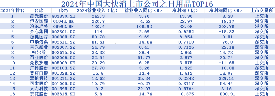 (快消品独家讯)上海市东方世纪消费品发展促进中心(简称:“东方快消品中心”)携行业领先全媒体——《快消品》汇总了在上交所、深交所、港交所、北交所上市的420余家大快消相关公司2024年业绩,按品类并通过主要经营指标——营业收入进行排名,公布“2024年大快消上市公司细分品类TOP榜”。此次,《快消品》带来:2024年中国大快消上市公司之日用品TOP16。其中,老牌文具巨头晨光股份稳居榜首,生活用品龙头恒安国际位列次席,潮玩新贵泡泡玛特跻身前三,展现出新消费势力的强劲增长潜力。在TOP16日用品上市公司中,它们2024年的总营收约为1118.28亿元;总净利润约为92.92亿元。